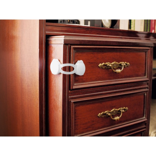 Fermeture sécurité à usage multiple court. Empêche l’ouverture des placards, frigos, toilettes. Adaptable à différents appareils domestiques grâce a sa flexibilité. Matérieau : ABS + PE , Couleur : Blanc