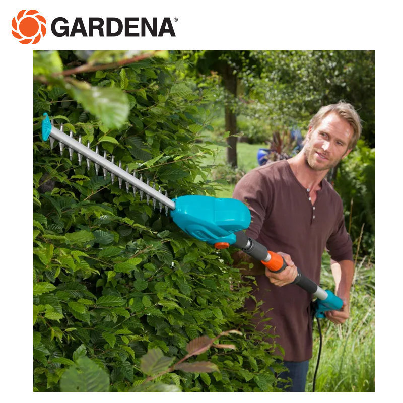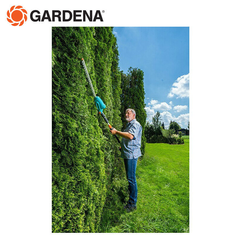 Le taille-haies sur perche électrique THS 500/48 de GARDENA vous aide à tailler les haies hautes. Vous pouvez atteindre une hauteur de 3,5 m avec la poignée télescopique réglable. Grâce à la poignée ergonomique et au point d’équilibre optimal, le taille-haies repose parfaitement entre vos mains. Pour mettre les lames de coupe dans la bonne position, il suffit de plier la tête du taille-haies. Cela vous permet de couper le haut de la haie confortablement et précisément sans avoir à monter sur une échelle. De plus, il est plus facile de couper la couverture végétale, vous n’avez pas besoin de plier les genoux. Grâce à la géométrie optimisée de la lame et aux lames de précision découpées au laser, la coupe de votre haie est propre et efficace. La protection contre les chocs à l’extrémité de la lame protège les lames du taille-haies sur perche électrique THS 500/48 de GARDENA lors de la coupe près du sol ou le long des murs de maison ou de jardin.