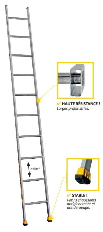 profils aluminium fermés pour une longévité superieure.Barreaux de forme légèrement arrondie pour plus de confort aux pieds.pieds équipes de larges sabots antidérapants bi-matière.Caracteristique : Barreaux aluminium antidérapants 28*25,5mm.Intervalle barreaux :280 mm.liaison performante montants/barreaux 3sertissages ,1 tulipage.