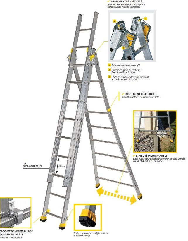 L’ÉCHELLE T2 EST UNE ÉCHELLE TRANSFORMABLE À BASE ÉVASÉE 2 PLANS DE LA GAMME MASTER.