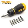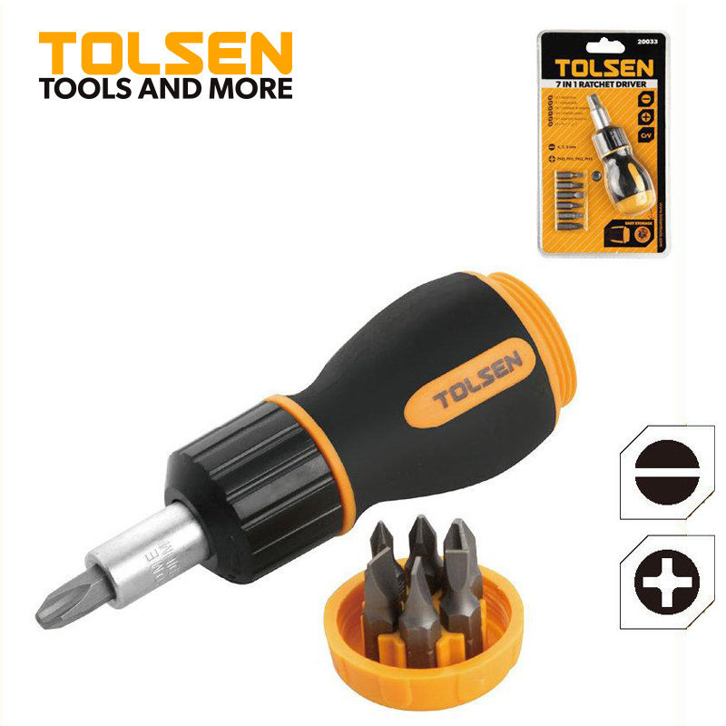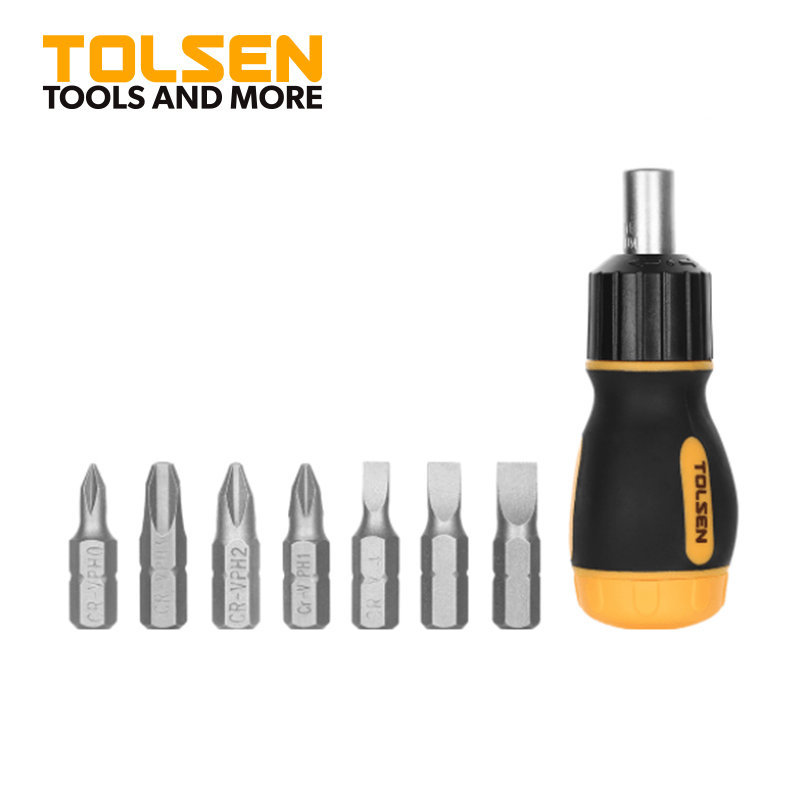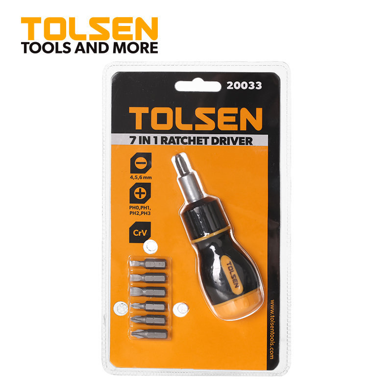 1 poignée à cliquet 7 embouts de 25 mm : 4,5,6, PH0, PH1, PH2, PH3 mm Matériau : Cr-V Emballé par double blister.
