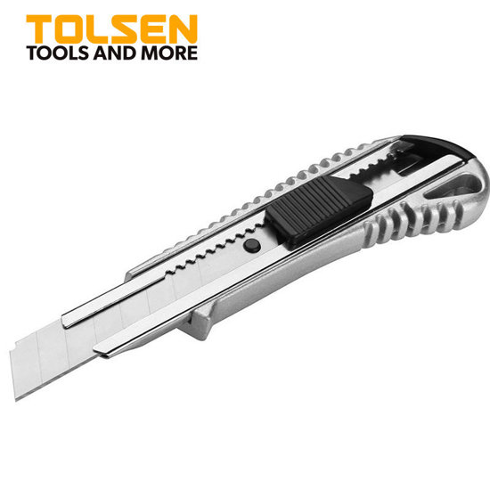 Boîtier en aluminium Taille de la lame : 18 x 100 mm Matériau de la lame : SK5 Avec bouton poussoir plat Emballé par carte coulissante.