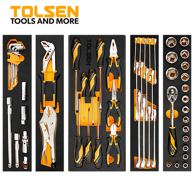 – Caisse à outils TOLSEN métallique 60 pièces, 5 plateaux (495x200x190). Douilles 1/2 tailles (8,10,11,12,13,14,15,16,17,18,19,20,21,22,24,27,30,32), un cliquet réversible 1/2 45 dents et un raccord universel 1/2. 13 clefs mixtes (8,10,11,12,13,14,15,16,17,18,19,22 et 24mm). Extension 1/2 125mm et 250mm. Adaptateur 3 voies 1/2, embout bougie 16 et 21mm). 7 tournevis (plat : 3×75, 5,5×100, 6,5×100, 8x150mm) Type Philips (PH1x100, PH2x150, PH3x150mm). Un jeu clef hexagonales longues embout sphérique (1,5, 2, 2,5, 3, 4, 5, 6, 8, 10mm). Une pince universelle 180mm, une pince long bec 160mm, une pince coupante 160mm, une pince étau 250mm et une pince multiprise 250mm. Acier au chrome vanadium. Systèmes de calage intégrés, retrouvez vos outils toujours propres et bien rangés. – Caisse à outils TOLSEN métallique 60 pièces, 5 plateaux (495x200x190). Douilles 1/2 tailles (8,10,11,12,13,14,15,16,17,18,19,20,21,22,24,27,30,32), un cliquet réversible 1/2 45 dents et un raccord universel 1/2. 13 clefs mixtes (8,10,11,12,13,14,15,16,17,18,19,22 et 24mm). Extension 1/2 125mm et 250mm. Adaptateur 3 voies 1/2, embout bougie 16 et 21mm). 7 tournevis (plat : 3×75, 5,5×100, 6,5×100, 8x150mm) Type Philips (PH1x100, PH2x150, PH3x150mm). Un jeu clef hexagonales longues embout sphérique (1,5, 2, 2,5, 3, 4, 5, 6, 8, 10mm). Une pince universelle 180mm, une pince long bec 160mm, une pince coupante 160mm, une pince étau 250mm et une pince multiprise 250mm. Acier au chrome vanadium. Systèmes de calage intégrés, retrouvez vos outils toujours propres et bien rangés.